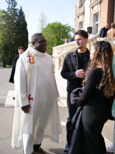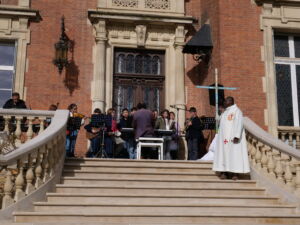 La célébration de Pâques qui s’est tenue dans notre établissement a été un moment fort, empreint de recueillement et de joie. En présence du père Thomas, la cérémonie a rassemblée élèves et personnels autour du sens profond de cette fête. Accompagnée d’une chorale, la célébration a été rythmée par de magnifiques chants, dont le très émouvant Resucitó, qui a su toucher l’assemblée. Ce temps de partage et de spiritualité restera un beau souvenir pour tous les participants.